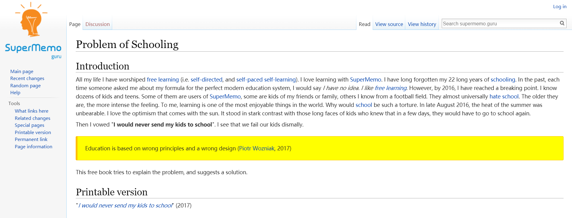 本文是 SuperMemo 作者 Piotr Wozniak 在文集 I would never send my kids to school[2] 中提出的有关教育改革的建议与理由,不代表译者本人意见。