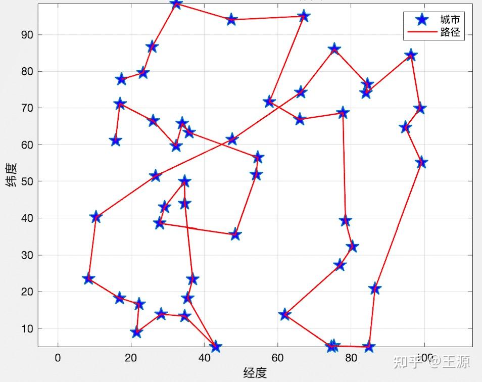 如下图所示就是一个TSP问题的解,图中的五角星就代表一个城市,图中整体上形成了一条路径把所有的城市连接在了一起,我们就是找到这样一种连接使得其总路径最短。