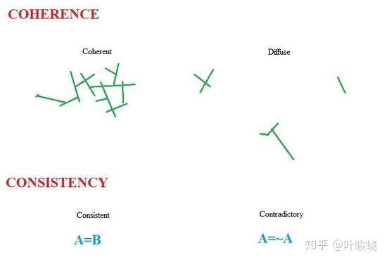 图:记忆的连贯性和一致性很容易混淆。连贯的记忆显示出高度的连通性。语义距离[17]短的有意义记忆具有高度的连贯性。记忆一致性表示记忆冲突[22]程度低。在连贯的网络中,一致性得到了很好的保留,但是,推理可能会导致冲突,从而导致更改(例如,由于干扰[4]而遗忘[23])。 知识进化论[24]逐渐提高了连贯性和一致性。既提高了知识稳定性,又能产生高质量的长期记忆