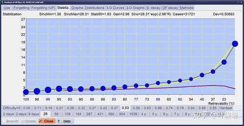 图:用 SuperMemo 计算的稳定化曲线。水平线显示的是时间,用记忆可提取性表示。竖线显示稳定化,即以记忆稳定性的增长来表示记忆持久性的增加。蓝色圆圈表示在给定的可提取性水平下,稳定性随着复习的进行而增加多少。蓝色圆圈的大小取决于收集到的数据点的数量。该图由进行 31,721次重复的 SuperMemo 中的数据产生,其中难度=0.53,稳定性=26[天]。稳定性增长从可提取性=100% 时的 1.36(SIncMin=1.36)增加到 R=0% 时的 26.31(SIncMax=26.31)。SuperMemo 中 R=90% 时的最佳复习产生 1.86 的稳定性增长(Stab90 相当于旧 SuperMemos 中的 O-Factor)。表示间隔效应的增益常数等于 2.96,即相对较高,因为符合低稳定性分位数。这个数据集的稳定度可以用公式(黄线)精确计算: ,产生 0.5069 的微小偏差。巩固曲线用紫色显示,并表明遗忘指数是所提出的数据集的一个可信的学习标准。对于 R 接近 100% 时,所呈现的图形的实际稳定性增长是 0.879,因为是用 2074 次测量得到的。这在图片中并不清晰可见,但可以通过 SuperMemo 中的稳定化矩阵导出进行研究。这意味着稳定化曲线公式在接近 100% 和 0% 的可提取性的极端情况下可能是不准确的。这可以解释为,没有任何记忆是可以完美提取或可验证地抹去的(见:我们永远不会忘记)。