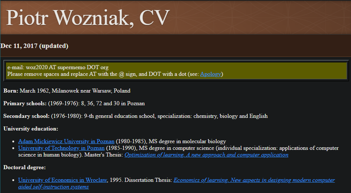 - 最早的间隔重复[16]计算机算法(商业上称为 SuperMemo[17])的作者(1982 年至今[18])