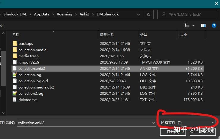 记得把右下角这个改成所有文件,因为 Anki 的数据库后缀不是 db 也不是 sqlite。