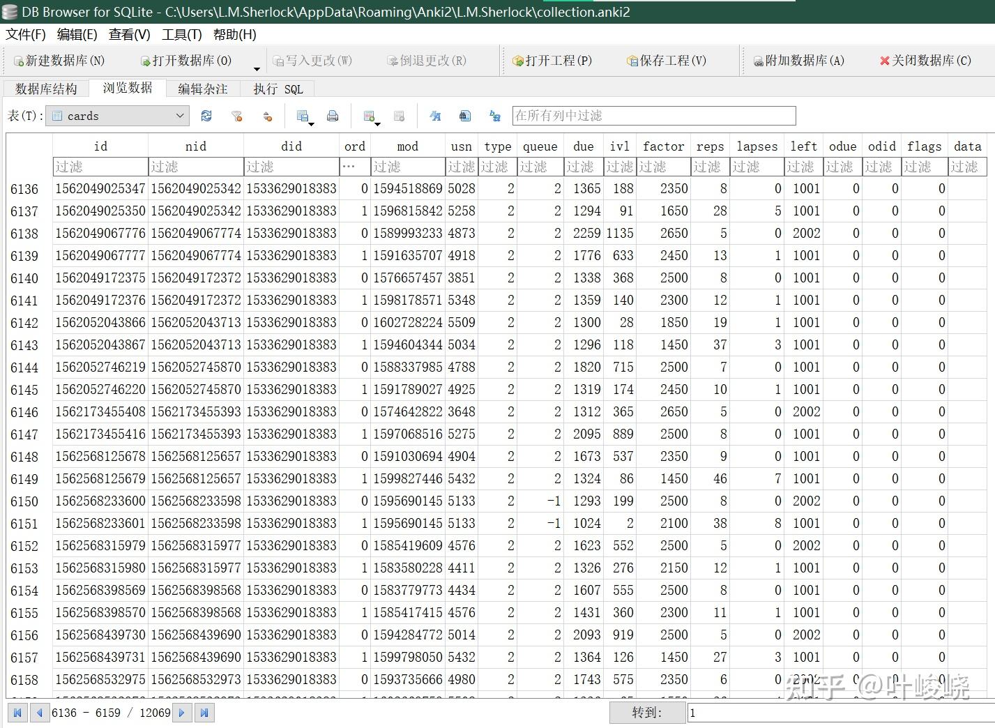 这是 Anki 数据库中的 card 表,记录了每张卡片的元信息。其中,根据 Anki 的源码,以及数据库的相关文档可知[3],参与复习算法的数据主要来自 ivl、factor、due。另外学习者的反馈也是 Anki 算法的重要输入,这里记作 grade。