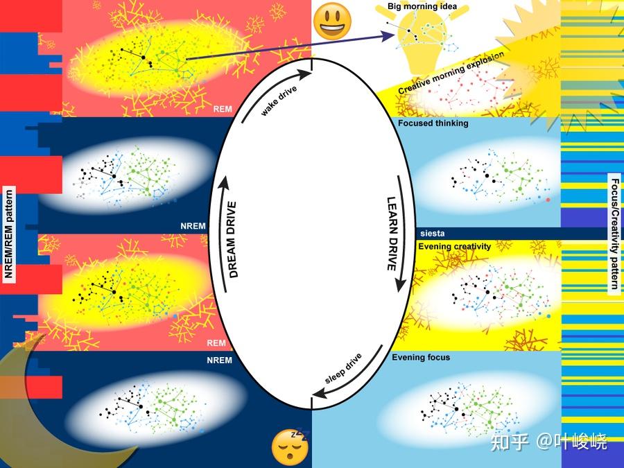 图:在自然创造周期中,创造过程和巩固知识之间有规律的相互作用。在自然创造周期中,创造过程和巩固知识之间有规律地相互作用。要想有较高的创造力和良好的学习能力,这些过程必须畅通无阻地进行。睡眠必须自然而然地到来,决不应该被打断。醒着的一天也应该有大块的时间保护,不受干扰、多任务和压力。从早上的创意爆发开始,激活的种子(红色)会逐渐转化为第二天早上出现的大创意。同时,学习、推理和创意激活会重新洗牌神经元连接。新的连接出现,得到加强,削弱,消除,或者被巩固,以便长期储存。所有的步骤对于最终大创意的出现都是必不可少的。详情请看。自然创造力周期的神经方面