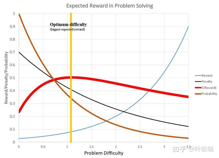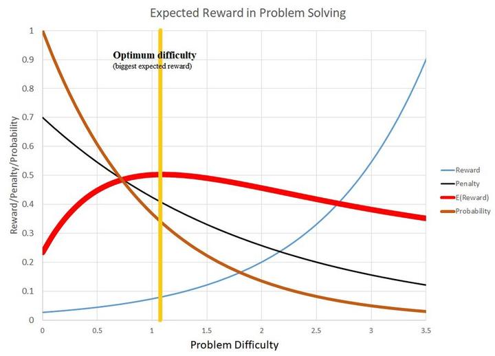 奖励来自于解题的价值,并随着问题难度的增加而增加。如果两个问题带来的收益相同,那么我们会更欢喜的是更难解决的那个问题。成功的概率随着问题难度的增加而降低。惩罚,即失败的痛苦也会减少。我们总可以说我一直都知道这个问题太难了,感受到的不适感最小。概率的依据是:预估(我是否解决了一个看起来类似的问题?),和实际统计(解决路径上的小失败和小奖励)。