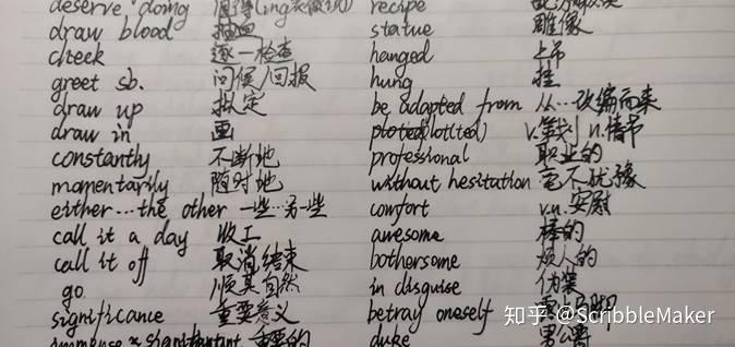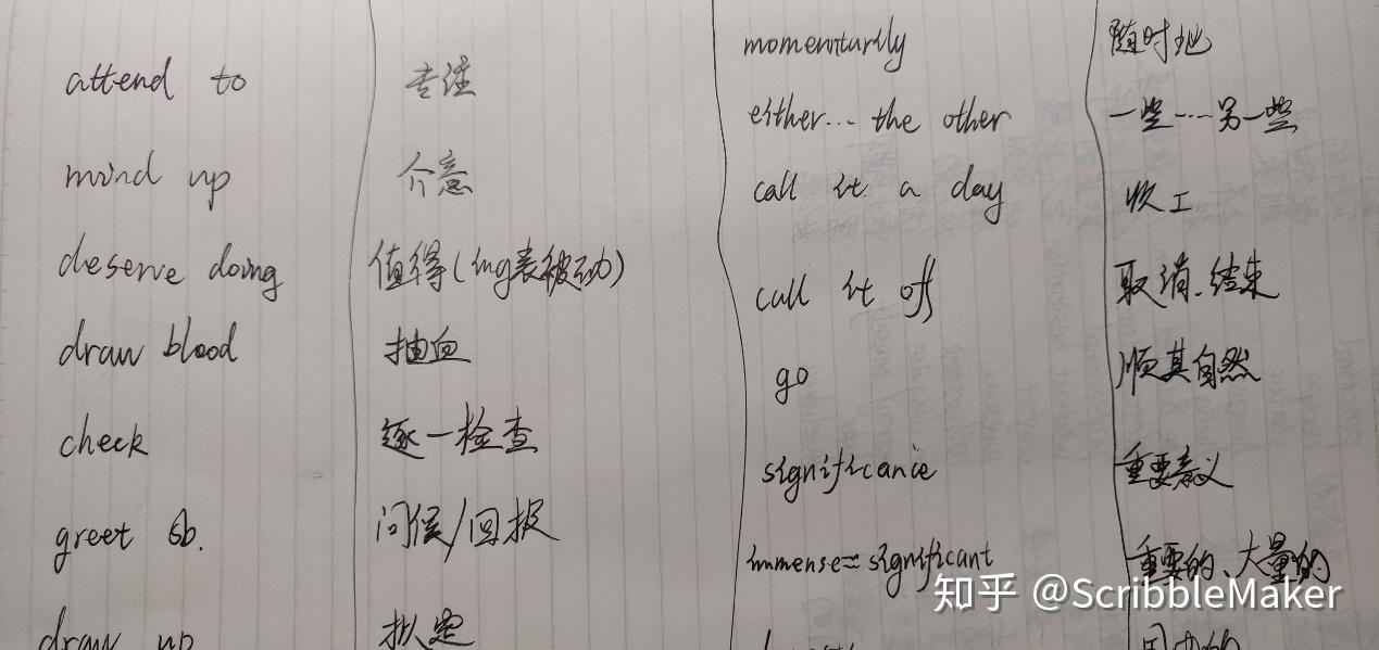 将笔记本横置,用随意的线条将版面大致均分为 4 列。松散地安置每条笔记的位置。这样一来,我可以肆意地加快我写笔记的速度,并且复习笔记时不会头皮发麻,很轻松地就能复习完一页笔记。而且这样也方便用纸挡住英文或中文的一列,测试自己是否能回忆出对应的意思。