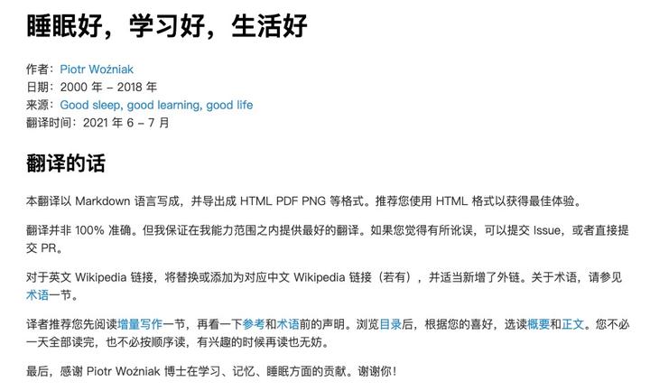 Colerar/Chinese-Translation-Good-sleep-good-learning-good-life: A Chinese Translation of an article in Supermemo.guru 中文翻译版的《睡眠好,学习好,生活好。》 (github.com)感谢你,拓展了中文的知识边界!