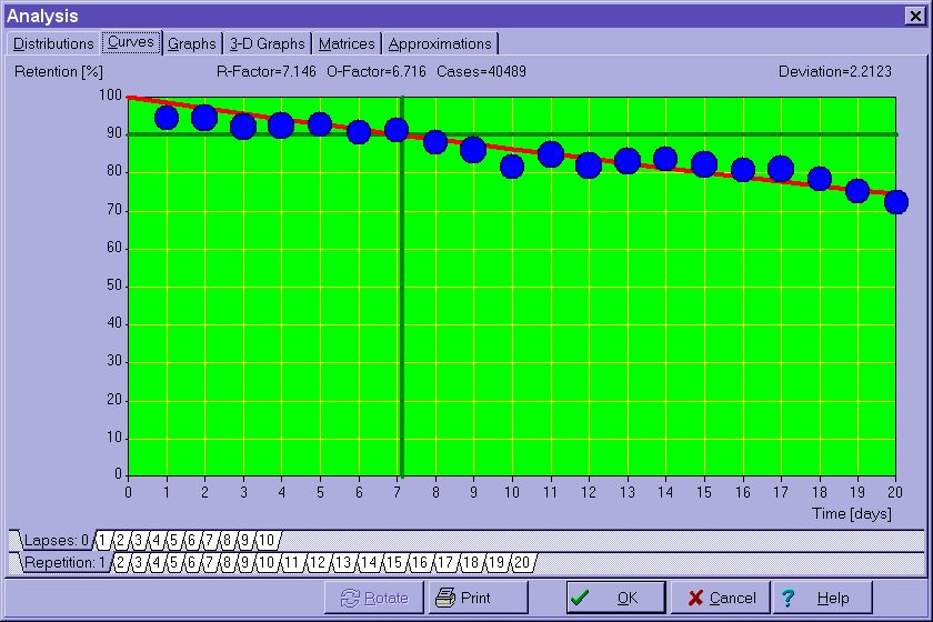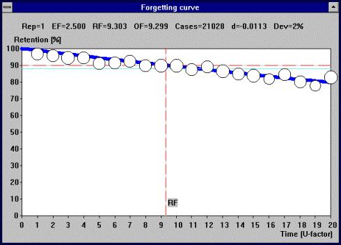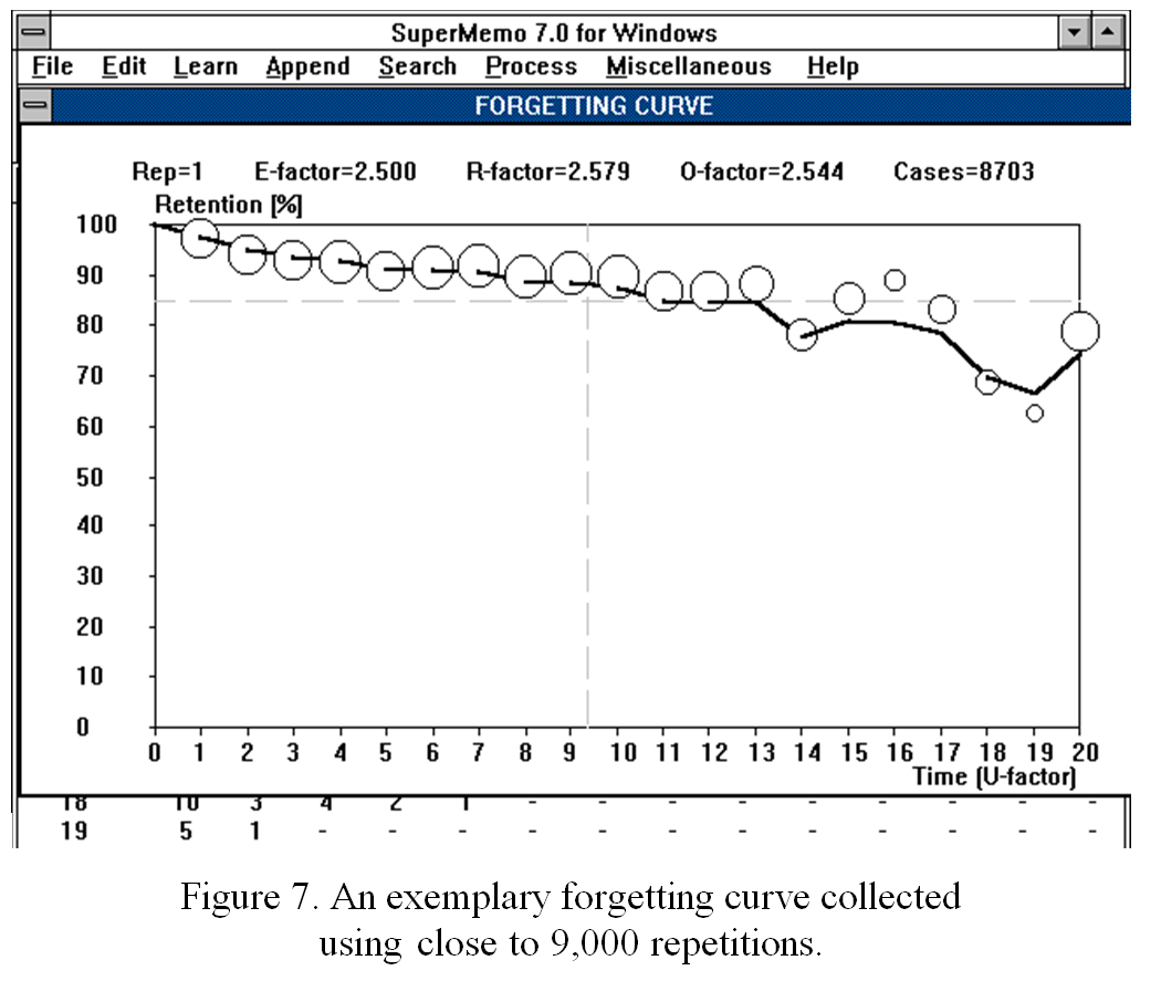 图:Windows 版 SuperMemo 7 是在 1992 年编写的。截至 1992 年 9 月 3 日,它能够显示用户的遗忘曲线图。标有 U-系数的横轴与这个特定图表中的天数相对应。第 14 天和第 20 天之间的奇怪弯曲是很难确定遗忘性质的原因之一。旧的错误假设很难被推翻。直到第 13 天,遗忘似乎几乎是线性的,也可能提供一个良好的指数拟合。我们又花了两年的时间收集数据,最终才找到答案(来源:《SuperMemo 7:用户指南》)
