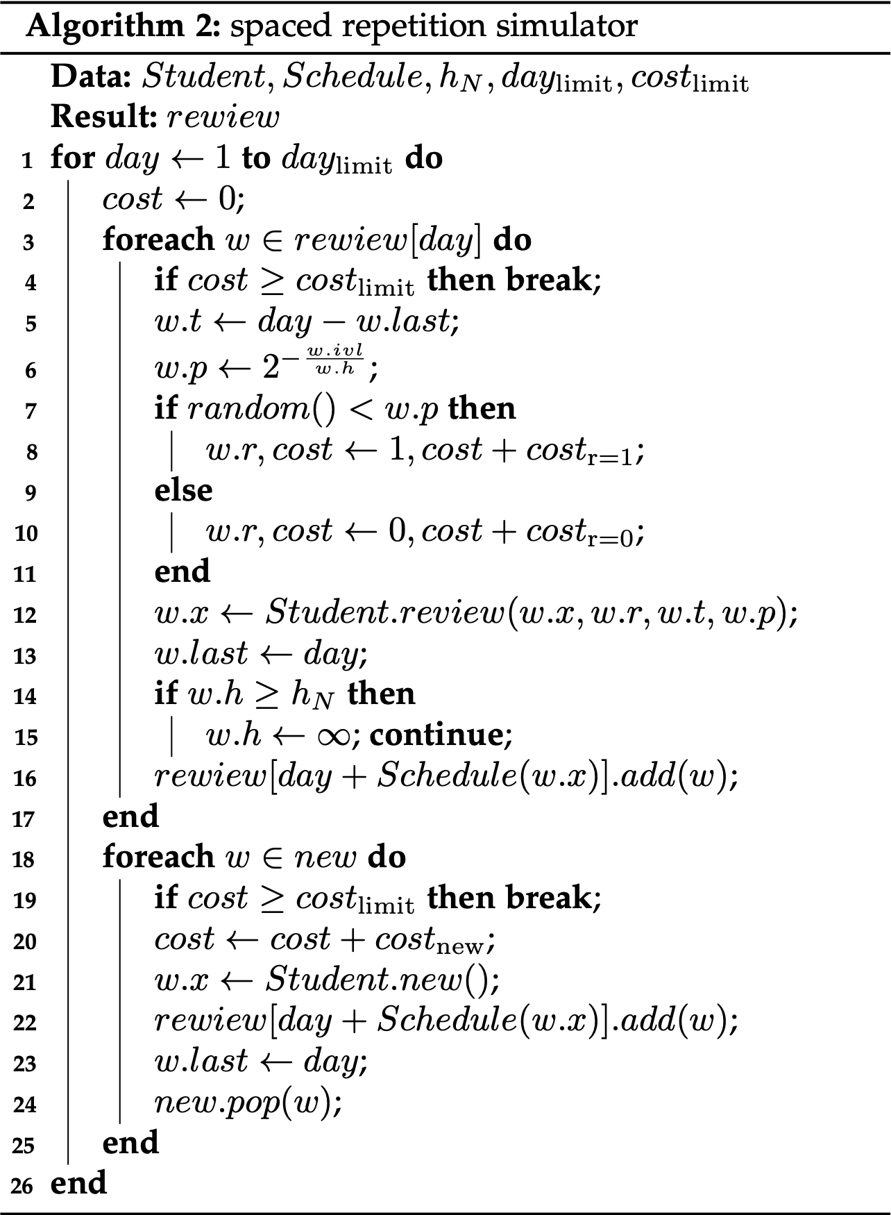 其中学习者可以用 DSR 模型进行模拟,给出每次复习的反馈和记忆状态。调度器可以是 SM-2、Leitner box、递增间隔表,或者其他任何安排复习间隔的算法。而模拟时长和材料集合则需要根据想要模拟的情况来设定。
