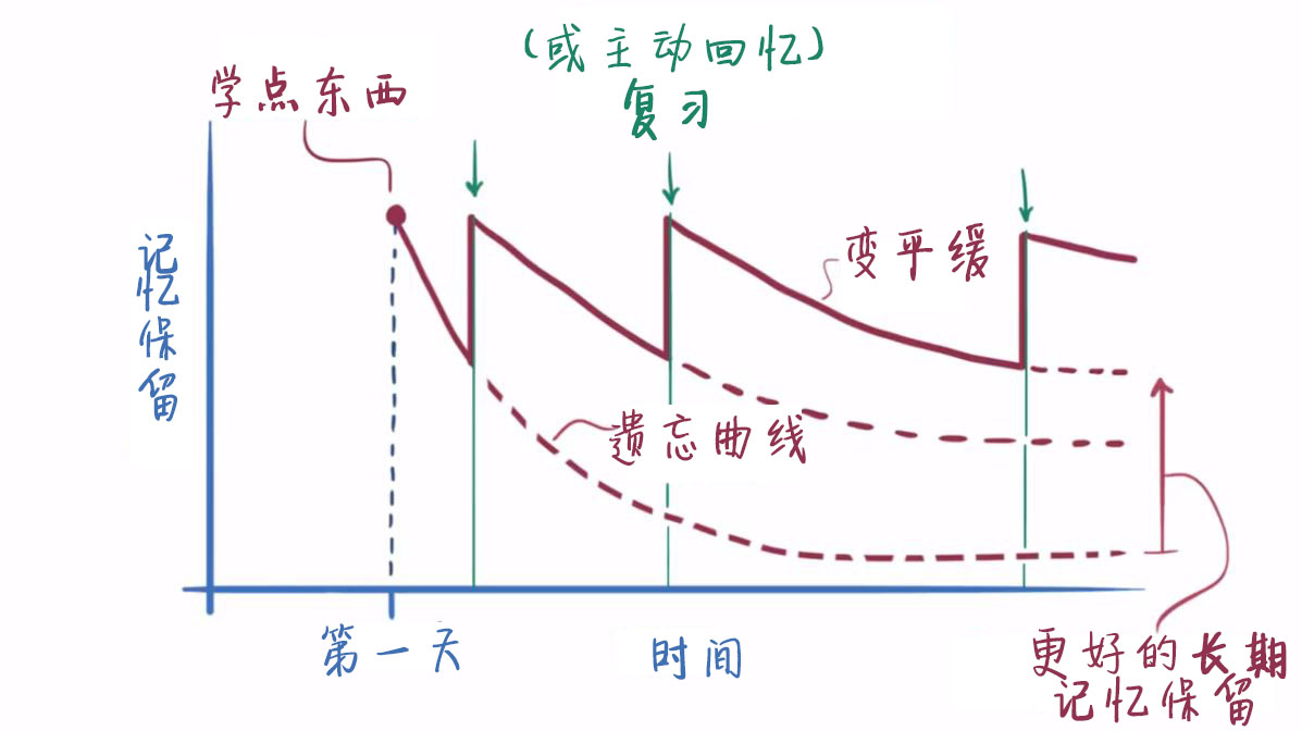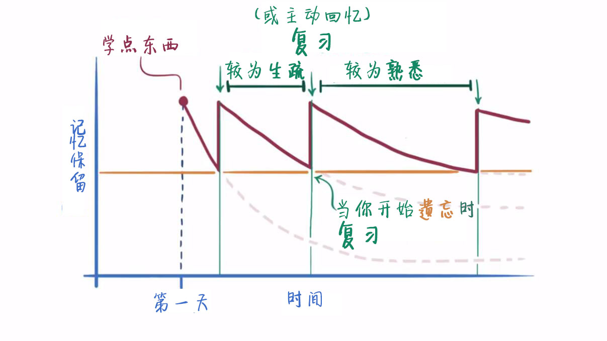第一天,当我们翻开课本,听老师讲课,学了点东西之后,随着时间推移,我们学到的东西在记忆中的保留量将像遗忘曲线那样持续下降。
