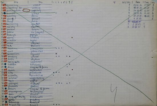 上面这张图片是沃兹的单词笔记本中的一页。79 页,总计 2794 个单词,每页约有 40 个英语-波兰语词对,如何管理它们的复习,让沃兹头疼不已。沃兹一开始没有任何规律的复习计划,复习任何一张笔记全取决于有没有足够的时间。但沃兹做了一件很重要的事情:记录了复习日期和遗忘数量。这使得他可以量化自己的复习情况。