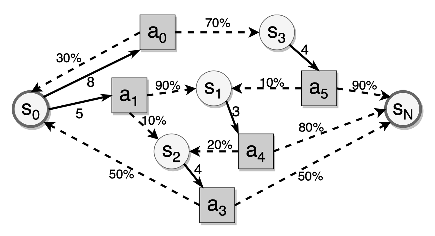 DSR 模型满足马尔可夫性,每次记忆的状态只取决于上一次的记忆状态和当前的复习输入和结果。其中回忆结果服从一个与复习间隔有关的随机分布。由于记忆状态转移存在随机性,一条记忆材料达到目标稳定性所需的复习次数是不确定的。因此,间隔重复调度问题可以视作一个 无限阶段的随机动态规划问题。考虑优化目标是让记忆稳定性达到目标水平,所 以本问题存在终止状态,可以转化为一个随机最短路径问题(Stochastic Shortest Path, SSP)。