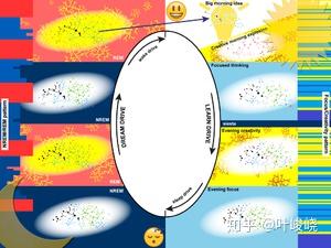 图:在自然创造力周期中,创造过程和巩固知识之间有规律的相互作用。为了获得高度的创造力和良好的学习,这些进程必须畅通无阻地进行。睡眠必须是自然的,不能被打扰。醒着的一天也应该有大块保护免受干扰,多任务处理,和压力。从早晨的创意爆炸开始,激活的种子(红色的)逐渐转化为第二天早上出现的一个伟大的想法。同时,学习,推理和创造性的活动重新洗牌神经元连接。新的连接会出现、得到加强、削弱、消除或整合以进行长期存储。所有的步骤对于最终的大想法的出现都是必不可少的。详情见:自然创造周期的神经方面