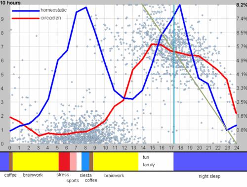 图:根据昼夜周期优化脑力工作的时间。 这个示例性的图表是在睡眠图的帮助下生成的,其基础是对自由活动的睡眠节奏的连续 3 年的每日测量。水平轴表示从醒来开始的小时数(请注意,自由运行的节奏周期通常超过24小时)。浅蓝点是实际的睡眠事件测量,时间在水平方向,长度在左侧垂直轴上。稳态睡眠可以粗略地表现为启动睡眠的能力。启动的睡眠事件的百分比被绘制为一条粗蓝线(垂直轴的右侧校准)。腺苷相关的稳态睡眠倾向随着脑力的增加而增加,并且可以通过咖啡因、压力等来部分清除。昼夜睡眠可以粗略地表现为维持睡眠的能力。启动的睡眠事件的平均长度被画成一条粗红线(垂直轴的左侧校准)。午间警觉性下降也是昼夜节律,但生理上是不同的,导致睡眠时间短,不是红色睡眠维持高峰。睡眠维持昼夜节律成分(1)与体温、ACTH、皮质醇、儿茶酚胺呈负相关;(2)与褪黑素、快速眼动睡眠倾向呈正相关。脑力劳动的最佳时机要求低的内稳态和昼夜节律的困倦。白天有两个高质量的警觉性障碍:第一个是在觉醒之后,第二个是在午睡之后。两个都在图中标记为黄色。为了获得最佳的学习和最佳的创造性结果,请使用这些黄色块。咖啡因只能在这个最佳窗口(棕色)的早期被用来提高警觉性。以后的使用会影响睡眠(咖啡因的半衰期约为6小时)。运动的最佳时间并没有标明,因为它可能会因时代的最佳时间而有所不同(例如,DSPS 的人是清晨,ASPS 的人是晚上)。有关更多细节,请参见:人类睡眠的双相性。