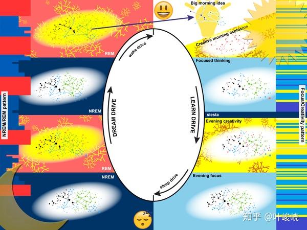 - 自然的睡眠-醒来周期产生的昼夜节律振荡,在醒来时创造力达到最大,逐渐转向专注思考,两种功能在为下一个睡眠周期做好准备时都最终减弱。