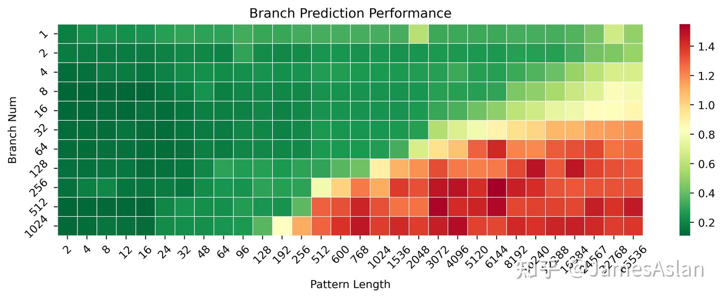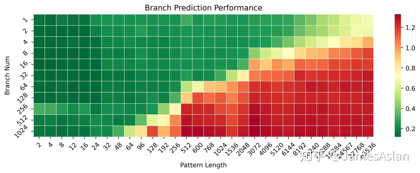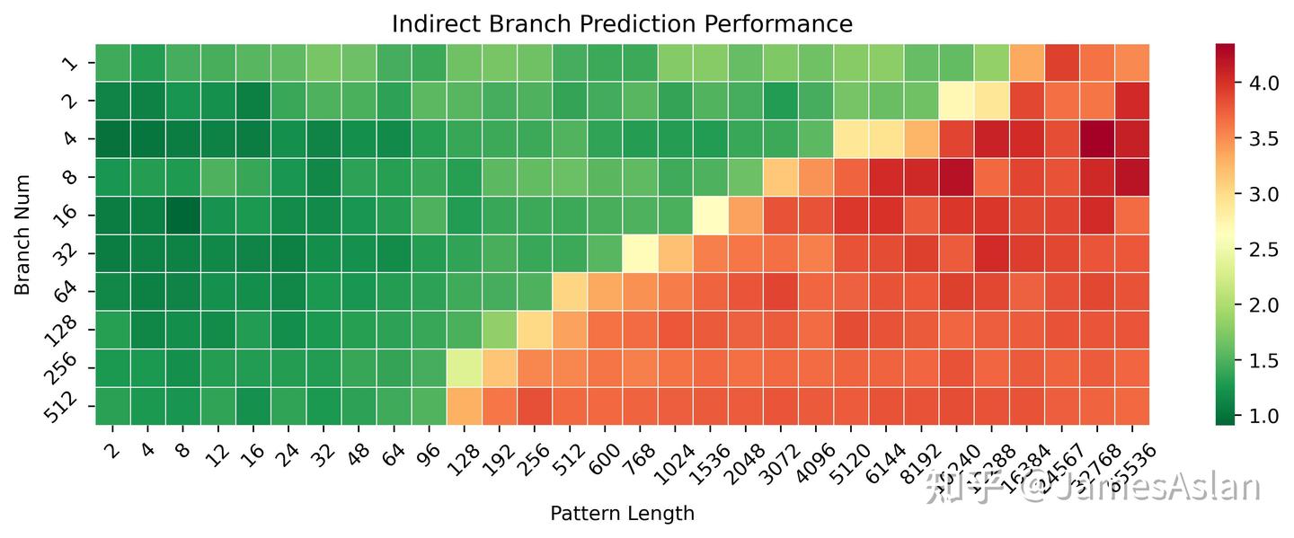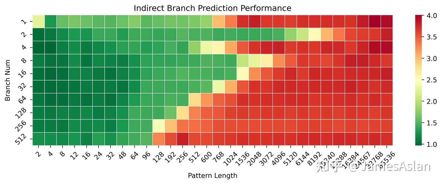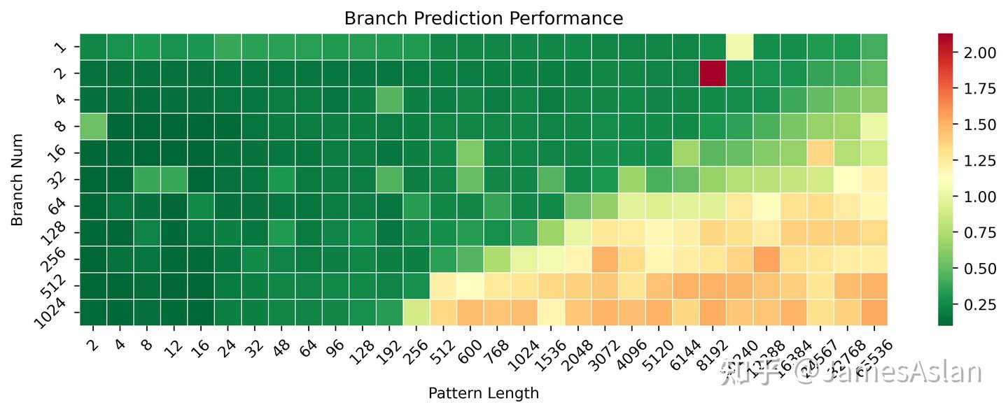 本测试考察分支预测器在不同历史pattern长度、不同分支数量(需要预测)情况下的准确性表现。相较X4,X925在长历史少分支的场景下表现变化不大,可能分支预测器维护的分支历史长度并没有升级;但是在短历史多分支的场景下有略微的提升,可能是TAGE的表项容量有一定的增加,此时的等效容量约增长了50%(并不一定是资源的直接增长,可能是table swap等等机制的调整)。