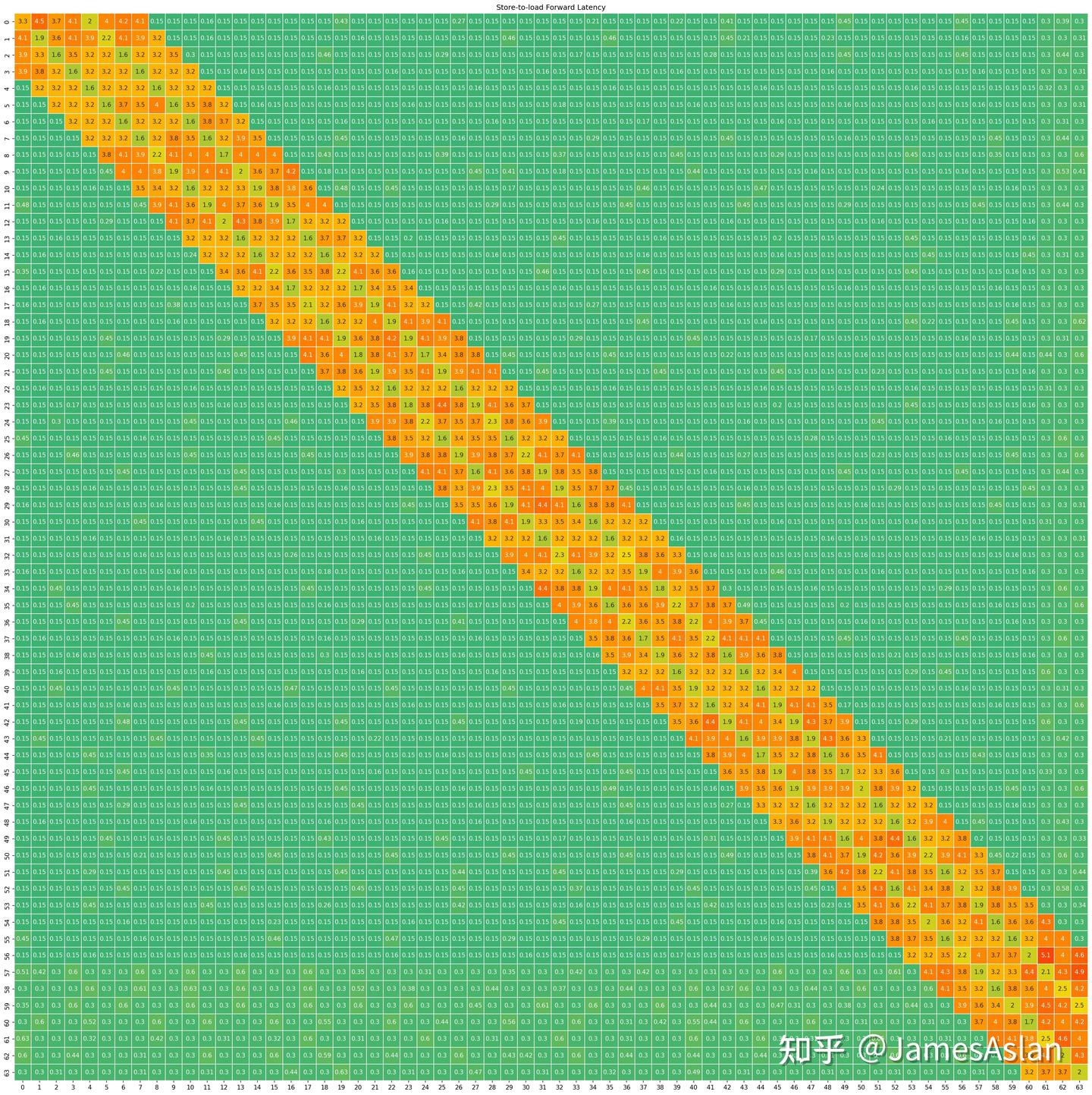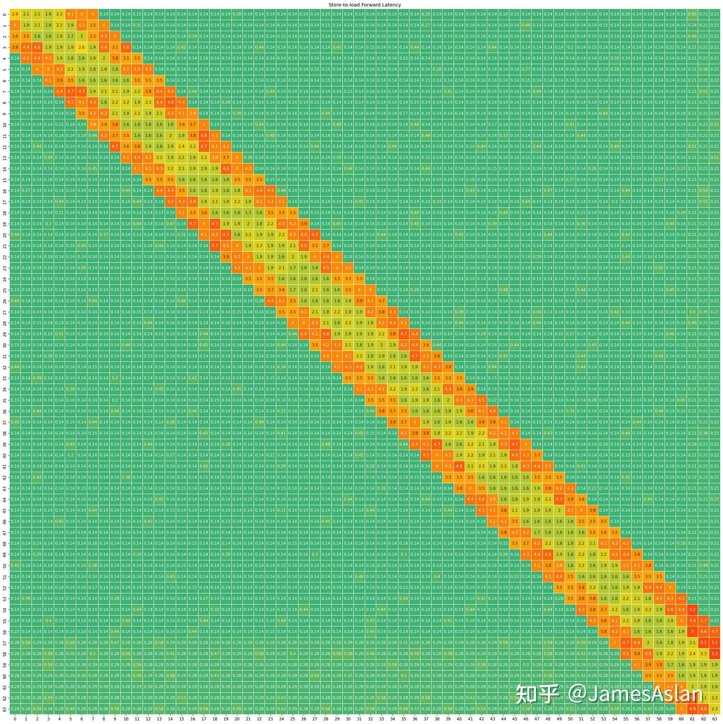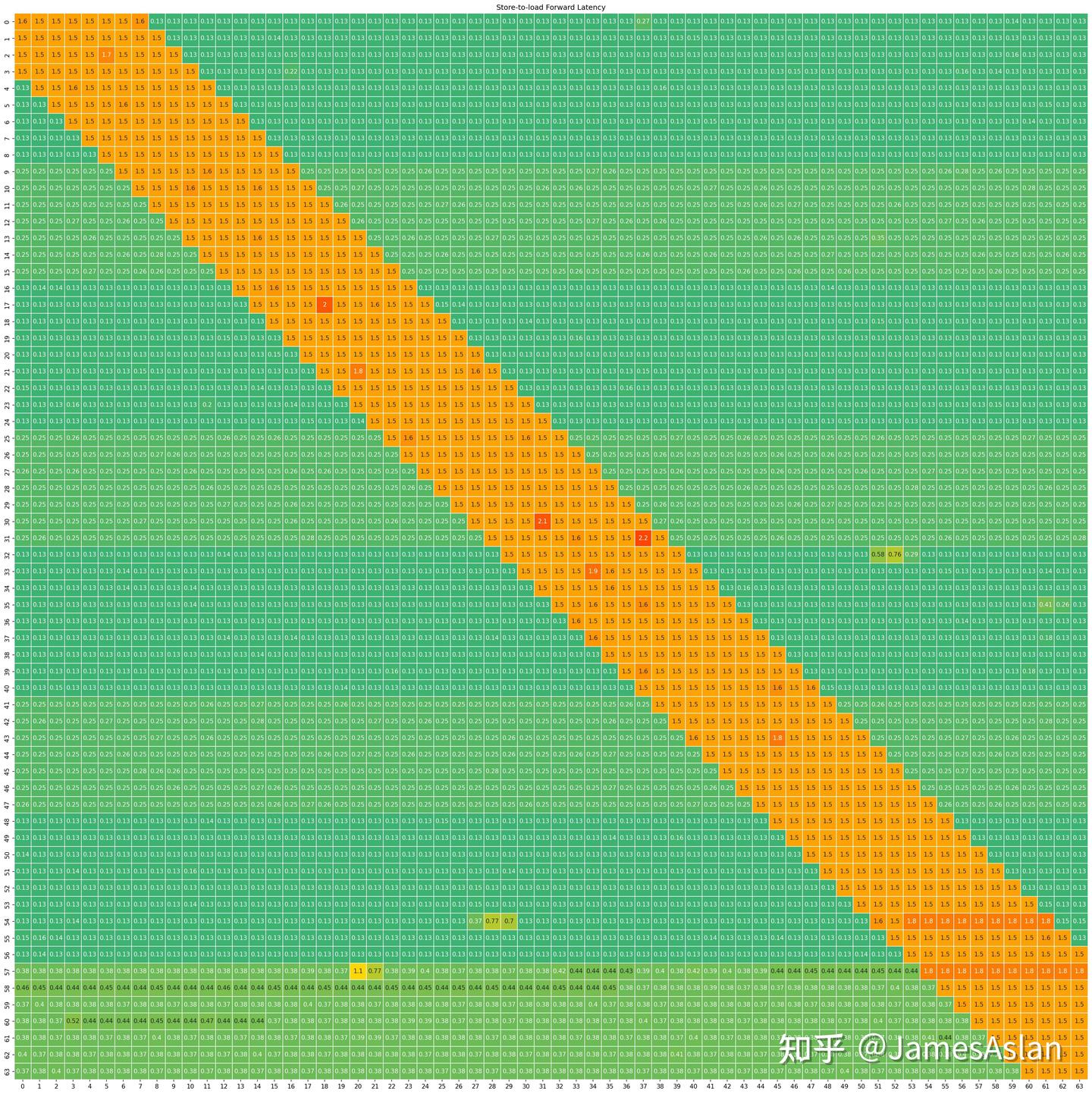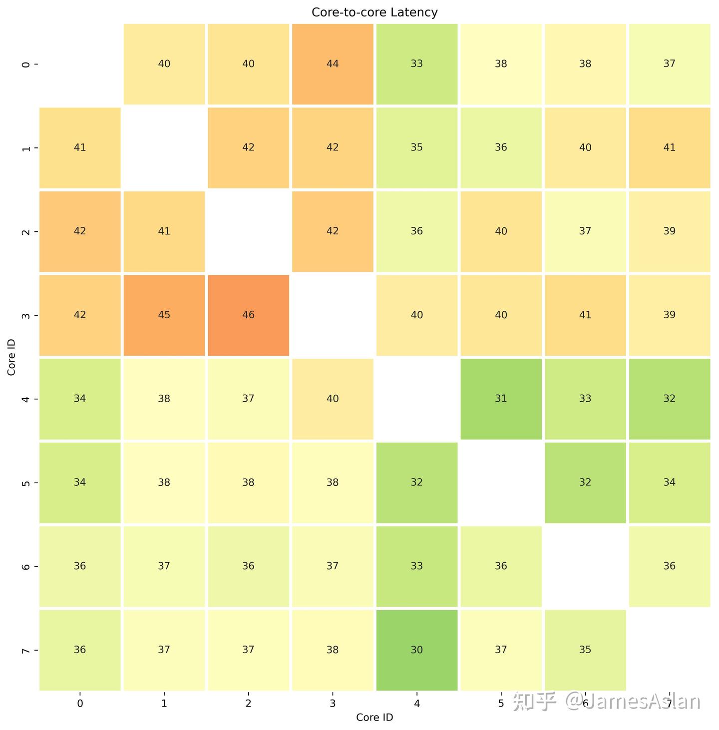 我们通过CAS测量Soc中两两核间的延迟(脏数据传递),其反映了处理器的一致性协议效率、LLC设计、总线设计等多个维度特性的交叠。