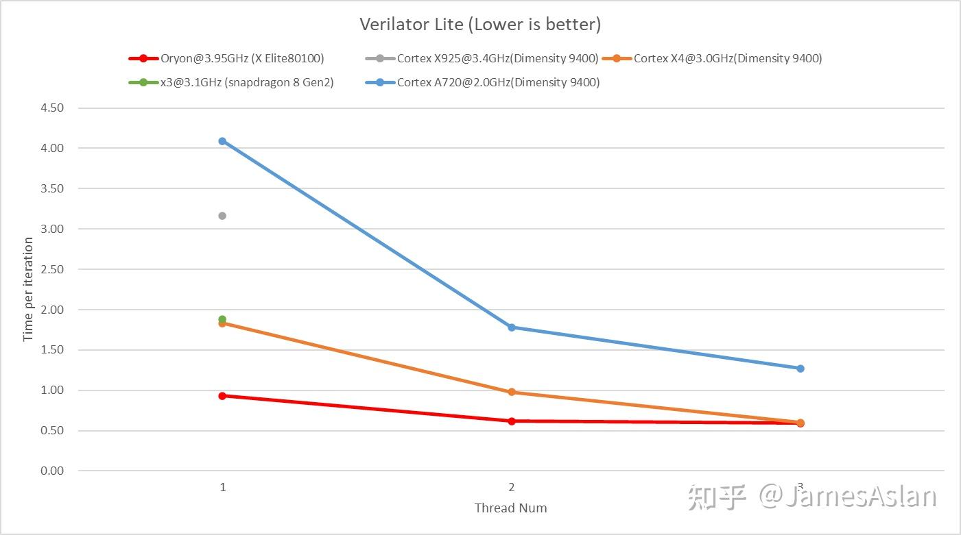不知道系统调度器做了什么,在使用单核单线程时,X925的表现异常,但是X4和A720却没有这一问题。因此,我们无法窥探X925在这一benchmark上的真实实力。X4m与X4的前端规格一致,并没有经历缩水,故X4m在这一负载上的表现十分出众,在3线程后就赶上了PC上的Oryon。谁能想到,有一天在手机上运行verilator居然能够获得与PC一样的性能呢,也许我们可以用手机主板组建集群以提升verilator仿真吞吐。