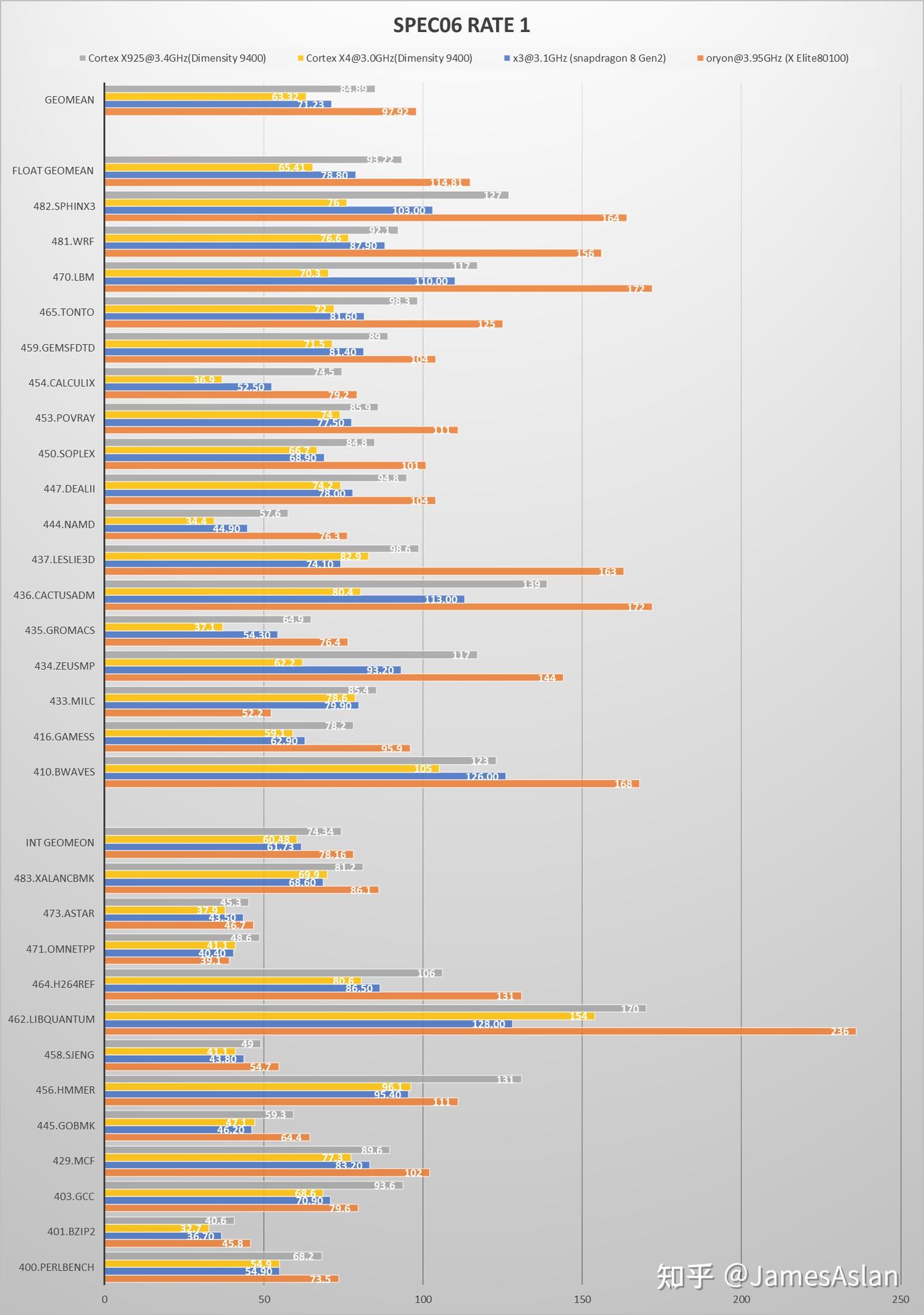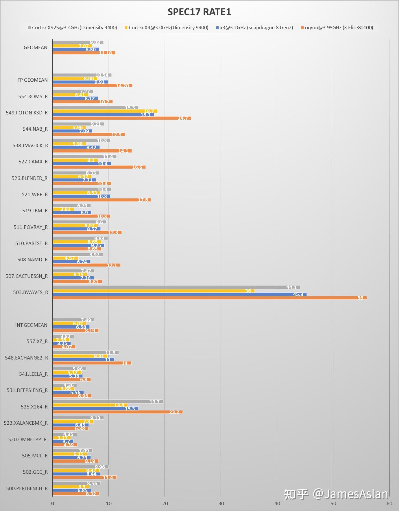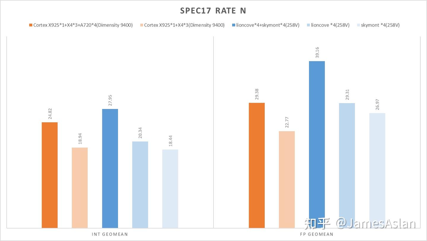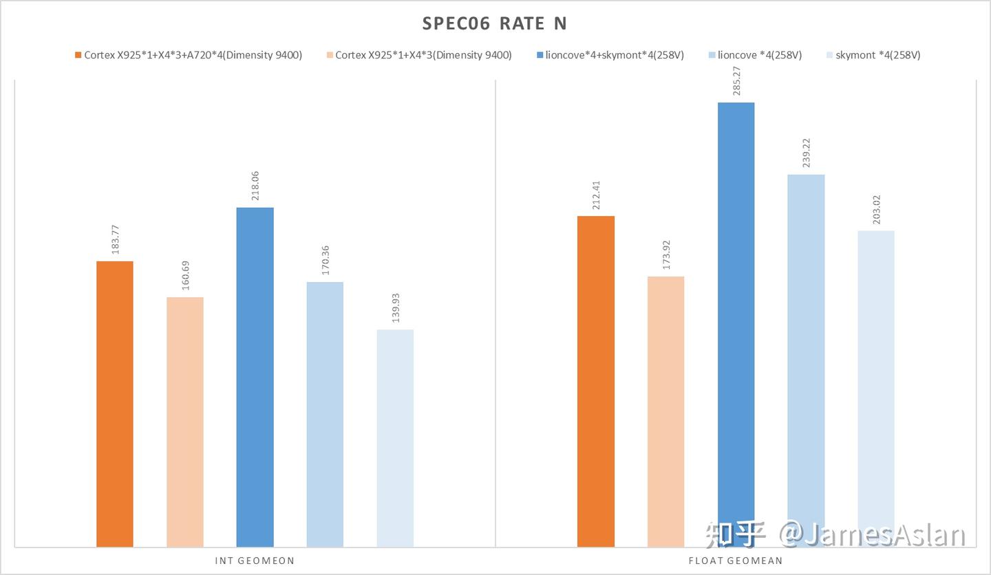 Warning!258V成绩处于WSL2下,近些版本Windows的WSL2都有严重性能问题,具体幅度众说纷纭,约5%~10%。但是考虑到天玑9400同样处于termux下而且被动散热,就算是大家都套上debuff图一乐吧,请勿作为严谨数据。以及,由于所用手机只配备了16GB内存,因此SPEC17的少部分子项在rate8下会进行内存swap影响性能表现,所以真的图一乐。这样的成绩可圈可点,天玑9400在rate4时于int端的表现与Lunarlake Ultra7 258V有来有回,大大出乎了我的预料。另外,以SPEC17int rate8为例,倘若不使用散热背夹成绩就会大幅下降,可见被动散热还是禁锢了天玑9400的真正实力。