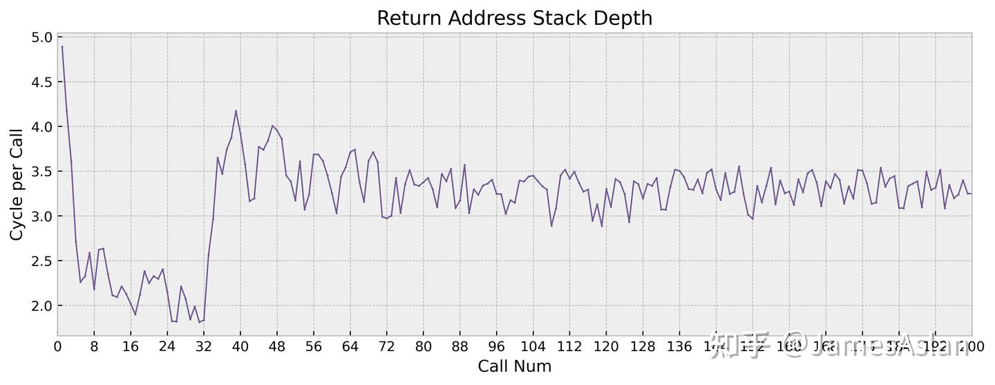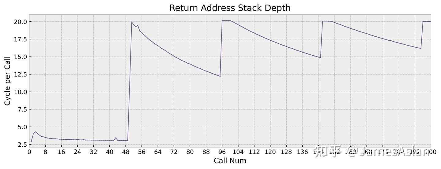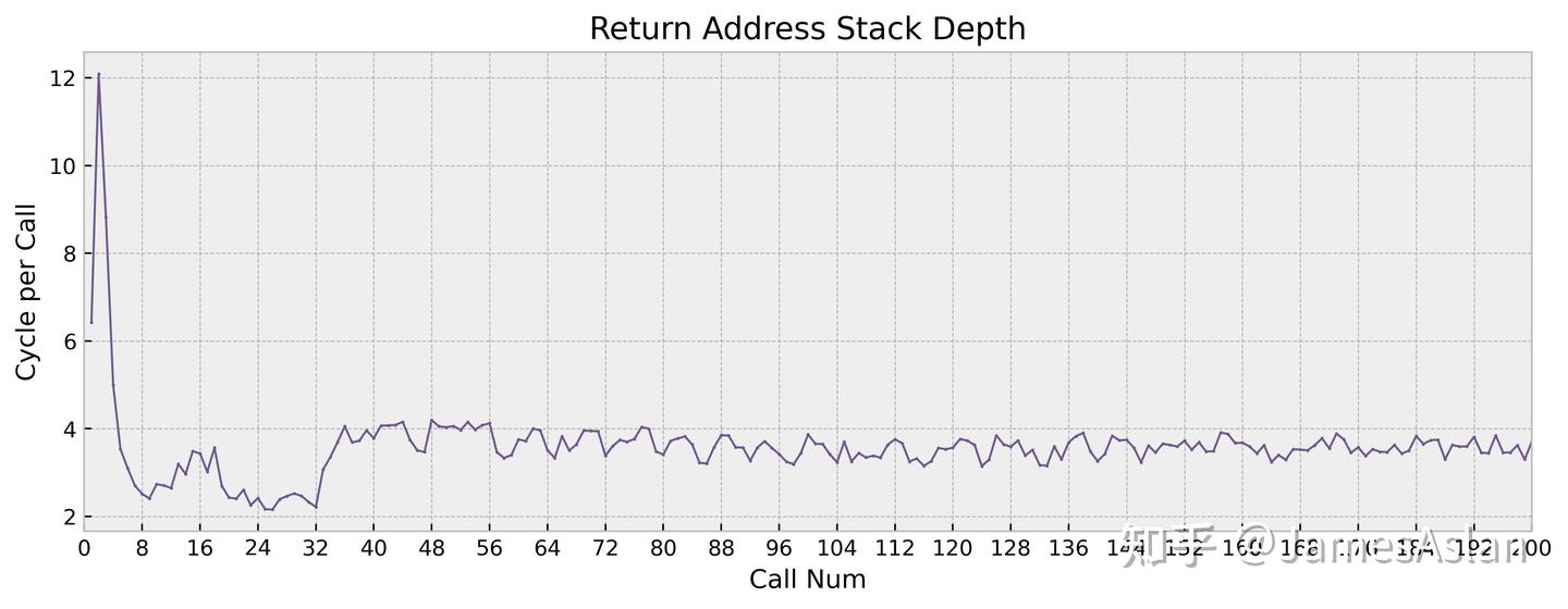 指令流中的call、return调用是较为特殊的分支指令情况,其栈形式的特征催生了专门用于预测此类场景的RAS(Return Address Stack)。简而言之,call指令压栈,return指令弹栈;而硬件栈(RAS)结构的深度就影响了处理器在复杂函数调用场景中的性能表现。