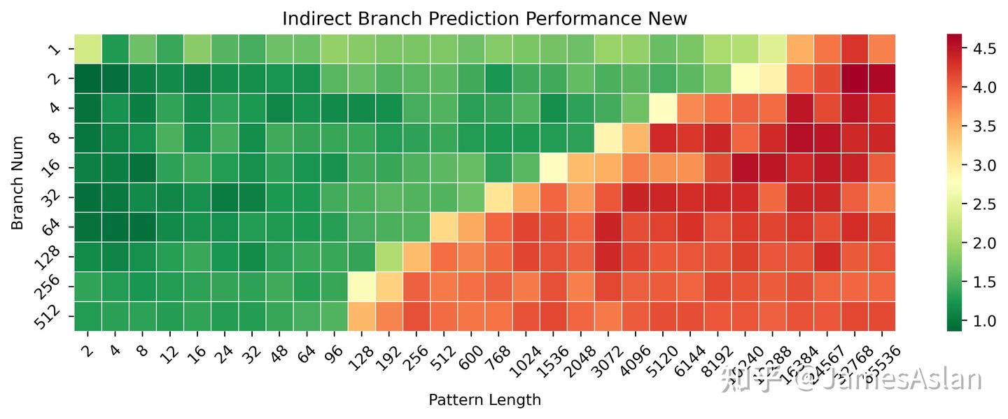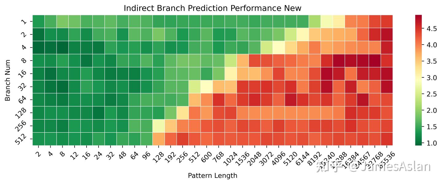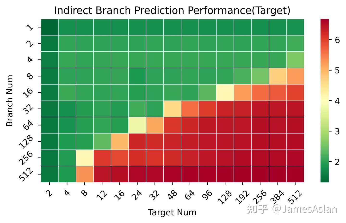 首先考察X925 IJP在不同历史pattern长度(但是可能目标均只有2个)、不同间接跳转数量(需要预测)情况下的准确性表现。在长历史少分支的情况下X925的准确性有一定的提升,可能历史的维护、hash方式有所改进;在短历史多分支的场景下表现基本不变,因此表项容量可能没有变化。