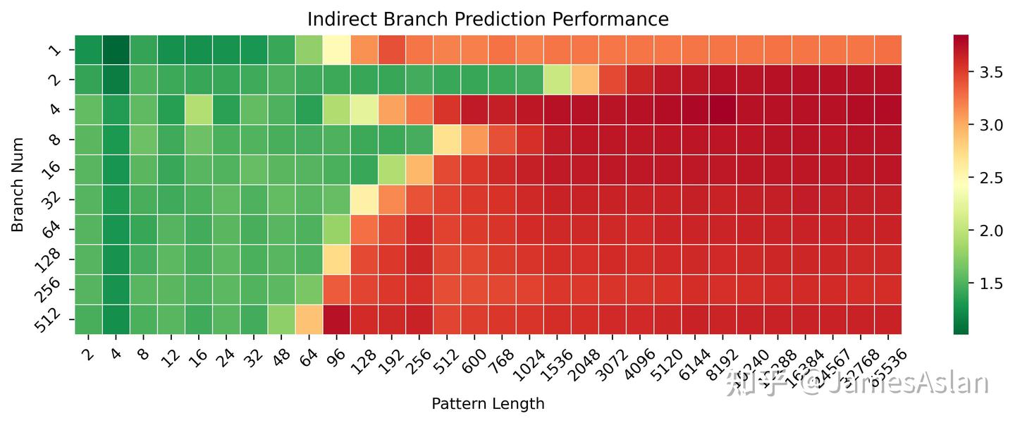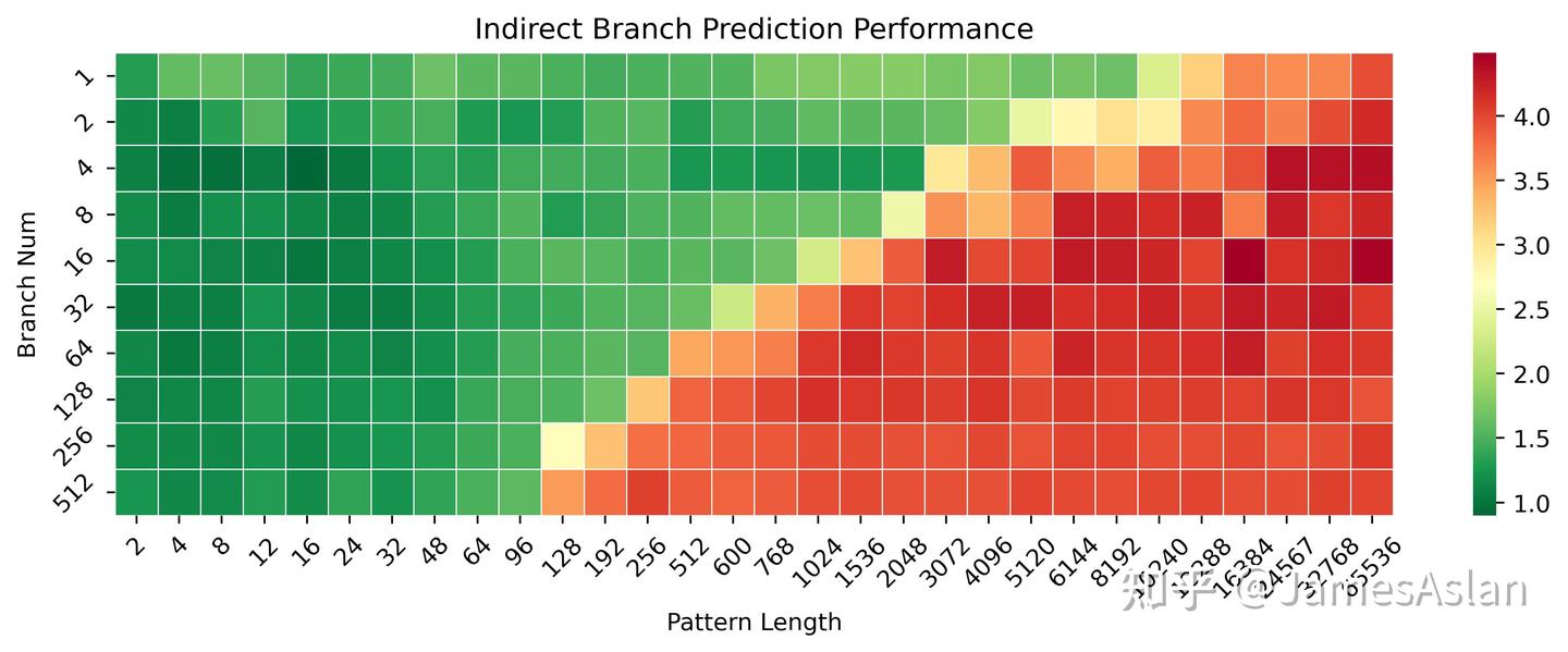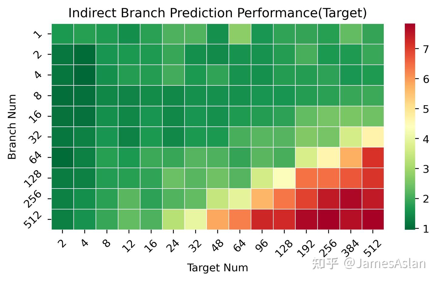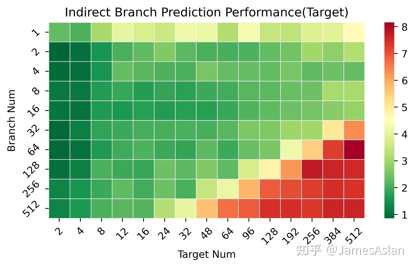 首先考察X925 IJP在不同历史pattern长度(但是可能目标均只有2个)、不同间接跳转数量(需要预测)情况下的准确性表现。在长历史少分支的情况下X925的准确性有一定的提升,可能历史的维护、hash方式有所改进;在短历史多分支的场景下表现基本不变,因此表项容量可能没有变化。
