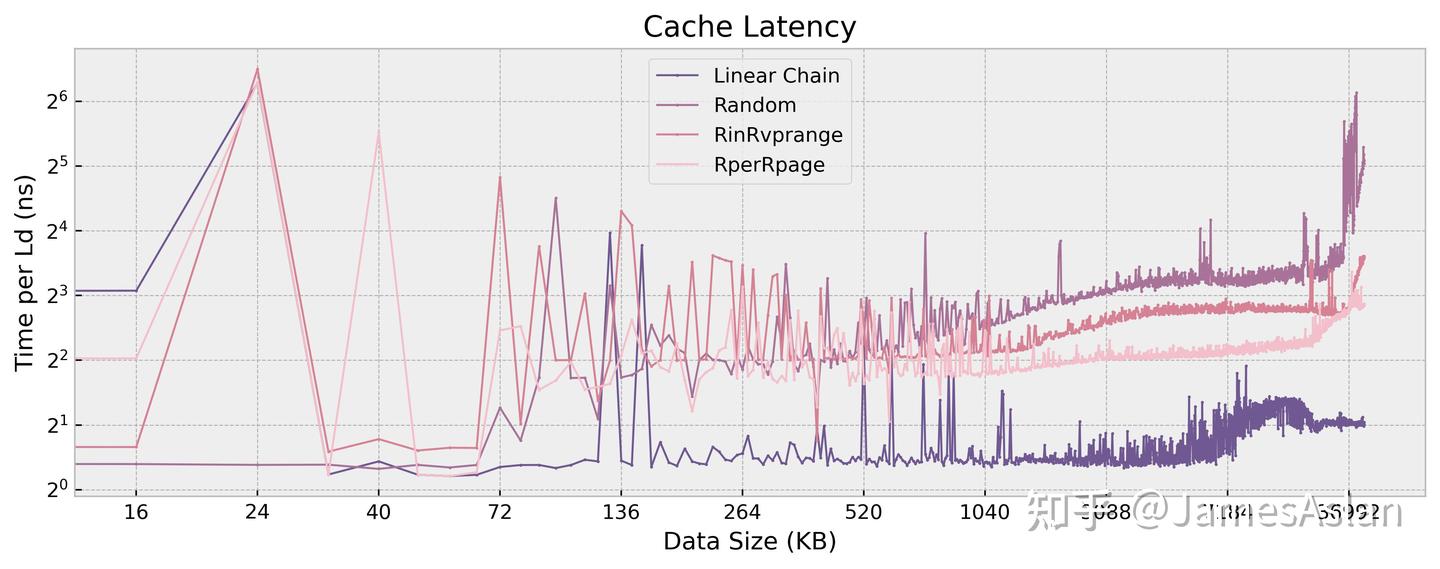 我们使用多种访存模式访问逐渐变大的数据(直至内存),以探究X925的Cache层级设计、预取器效果、内存控制器效果。(原谅它频率不稳,所以图很难看)