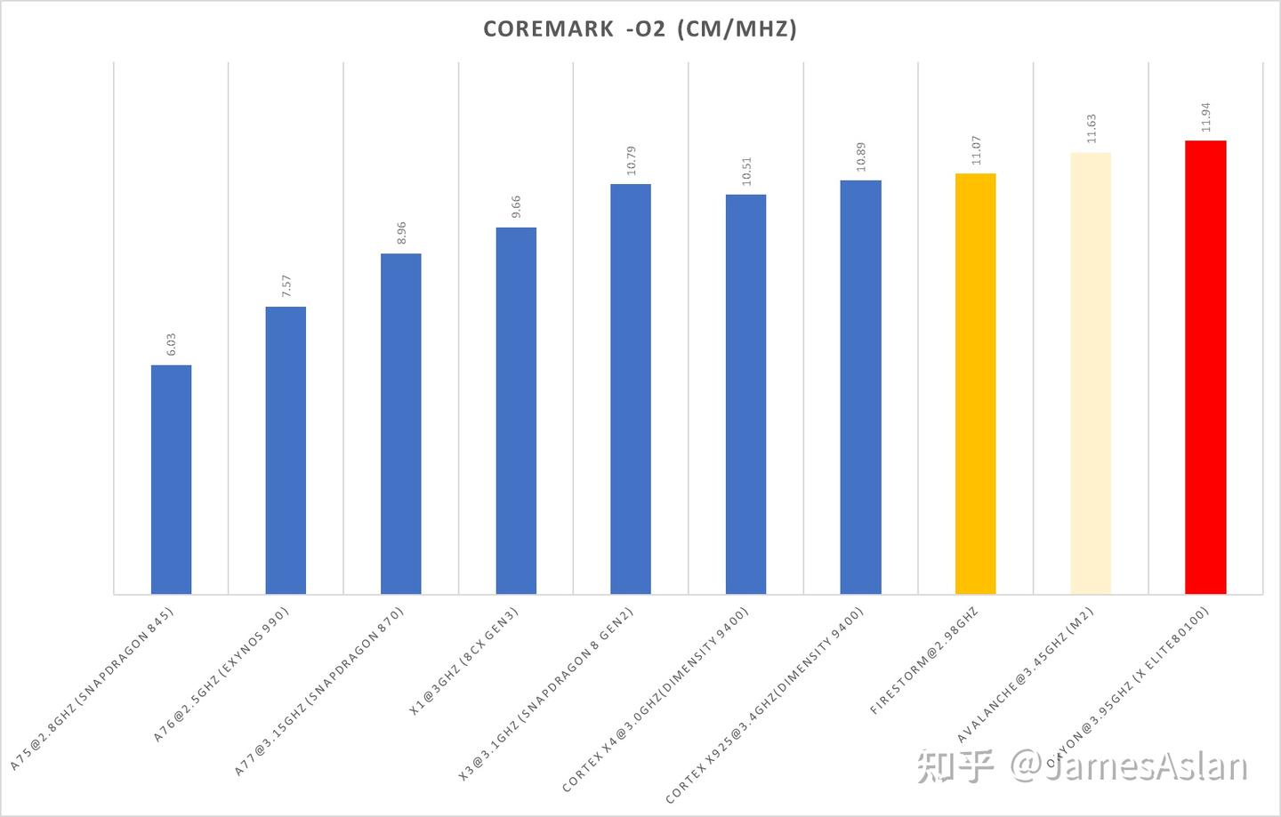 我们这次呈现从A75开始的,每年Arm最大规模的核心的Coremark成绩的变迁(没有X2,没摸过嗷)。可见,从X3之后,成绩的增长就陷入了停滞。在之前的Oryon测试中我曾经提及:Oryon已经十分接近当下8发射6ALU处理器的coremark巅峰了。实际上8发射6ALU处理器完全能够冲击12+CM/MHz,但是Arm在10发射8ALU时仍然远远不及,可想而知主流水线内有多少设计妥协。其实,在对X3和X4的测试中就可以看出,Arm的主流水线总是充满了各种各样奇怪的限制。例如:X3配备了6个ALU但是持续带宽只能等效4ALU,X4虽是10发射但是基本没有指令的持续带宽能够达到相应预期。